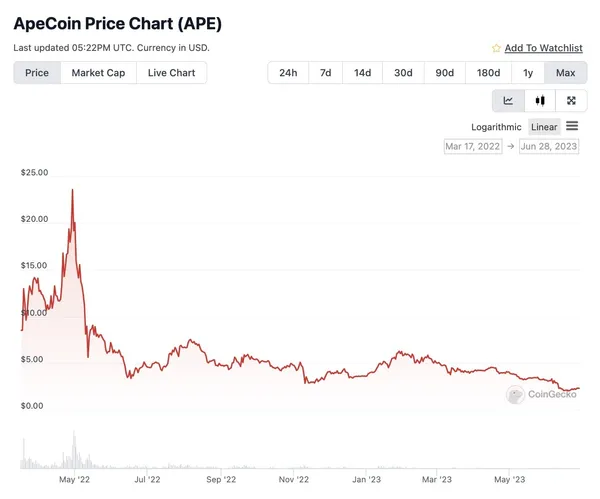 最後一點,$APE代幣自從發行後,從最高點一枚$APE 23美金(約為690元台幣)到現在是一枚2美金(約為60元台幣)。