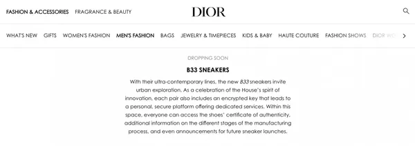 知名奢侈品牌迪奧(DIOR)新款「B33」球鞋系列即將開賣。不同於傳統鞋款,這一系列的球鞋注入了區塊鏈技術。