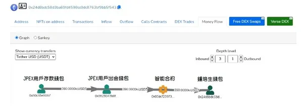他透過免費公開的鏈上工具,調查了 JPEX 交易所與鍾培生的交易細節,並聲稱該交易所是把用戶錢包中的 39 萬枚 $USDT 轉出,再透過智能合約的方式,轉到了鍾培生的錢包中,如下圖: