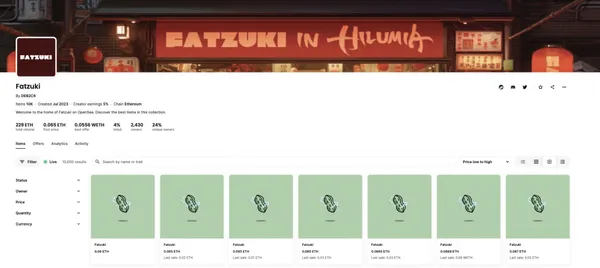 Fatzuki項目總量有10000個,目前已全數發售完畢,但尚未解盲。當時白名單價格為0.0069枚以太坊,公售價格為0.0088枚以太坊,而最高的地板價格為0.09枚以太坊,目前地板價格為0.065枚以太坊。目前該項目漲幅超過十倍,對於當前熊市中的二創項目而言,已是極其亮眼的表現。