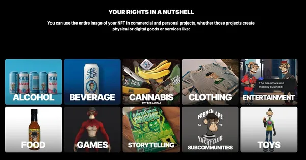 BAYC、MAYC持有者,可以在商業和個人項目中使用其NFT的整個圖像,無論是實體商品、虛擬商品或是服務都能使用。