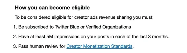 根據目前Twitter官方釋出的分潤計畫規則,必須符合以下條件才有機會獲取廣告收益: