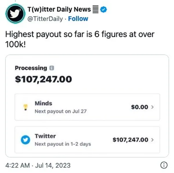 由於Twitter目前尚未明確公布分潤的規則,因此大家只能從獲得分潤的創作者那裡得知收益。根據T(w)itter Daily News的分享,最高的分潤金額是107,247美元,相當於320萬台幣,非常驚人。