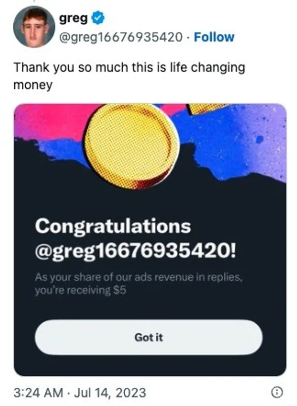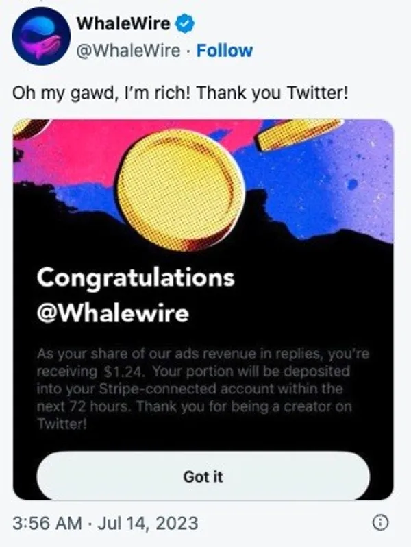 今年六月,埃隆·馬斯克(Elon Musk)發出推文說明,Twitter將把回覆內的廣告收益分享給官方認證(藍勾勾)的創作者,首批分潤總額為500萬美元(約為1億5千萬台幣)。