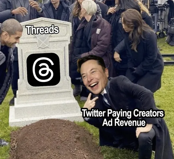 有些創作者的收益僅有個位數,他們則以幽默的方式回應,「感謝Twitter給我改變人生的錢」、「天哪!我是有錢人了」。最有趣的非下面這張迷因圖,由於分潤計畫讓Twiiter大獲全勝,馬斯克在Thread墳墓前比Ya。