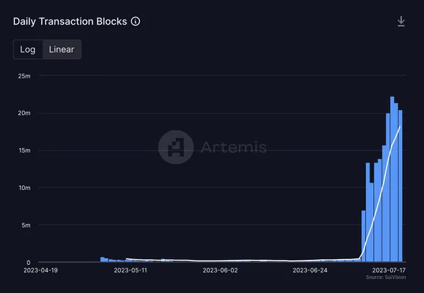 原來,從上週開始,Sui 網路的交易量突然出現暴增,不僅單日交易量最高達到 2,220 萬筆,單週交易量相較前兩週更成長超過 50 倍,甚至一度在日交易量上超越了 Solana 的 1600 萬筆。