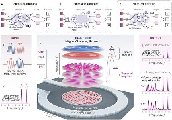 磁振子散射儲層(magnon-scattering reservoir)的模式識別工作原理。