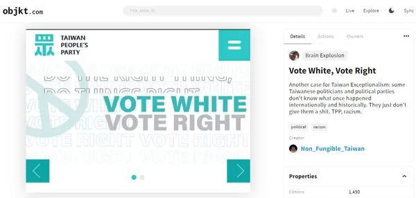 民眾黨「投白、投右」爭議標語上鏈!官網畫面被製成1,450顆NFT、永久紀錄