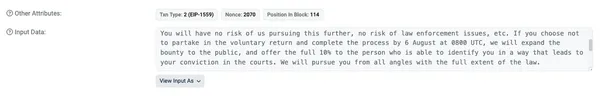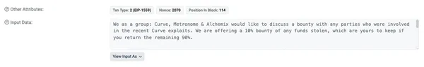 8月3日,Curve Finance、MetronomeDAO及Alchemix Finance團隊,進一步行動,嘗試與駭客展開對話,三個團隊共同透過以太坊,發送了一條鏈上訊息給駭客。