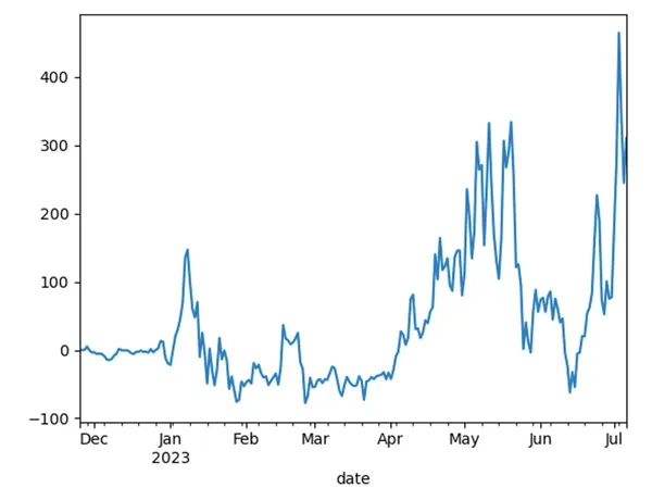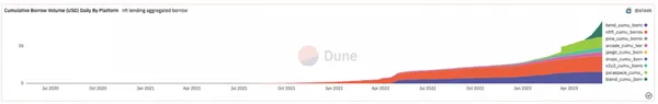 我們可以透過觀察 NFT 借貸、衍生品相關產品的生態狀況來發現,在借貸方面,從 2022 年 4 月開始有顯著的發展,一直到今年四月,各個相關借貸平台的累積借款金額已達 16.5 億美金,相較於去年,規模增長約 500%。在衍生品交易上,nftperp 的未平倉合約也穩定增長到 3,300 ETH 的開倉量。
