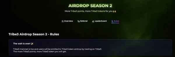 在 2023 年 5 月份開始正式公測,同時啟動 Season 1 的代幣空投計畫,主要獲得 token 的方式是累積 Tribe3 points,累積越多的 points 就能獲得到更多的 token,points 可以透過交易、社群互動與活動參與等各種方式來獲得,要開始前必須先輸入邀請碼才能開始進行交易,開始交易後首先的第一道任務是交易量需累積達 5 WETH,便可以解鎖其他 points 的獲得方式。
