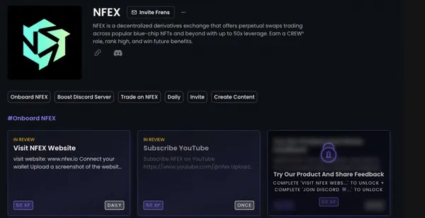 NFEX 有一個 CREW³ program,前往 Questboard(邀請連結)就可以透過參與各式活動來獲得 XP points,當你累積的越多 points 以及獲得 CREW³ 的角色時,在未來就可以獲得福利與空投機會。