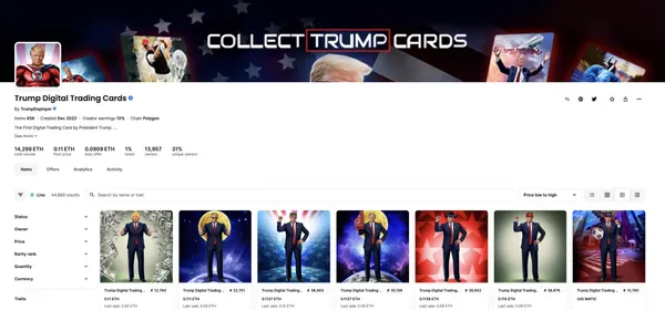 2022年12月,川普宣布發行限量版的45,000張卡牌NFT,價格為99美金(約為3千新台幣),在24小時之內銷售一空。這些卡片以川普為主角,有各種逗趣的造型,像是獵人迷彩、焊工裝和超級英雄裝扮等。
