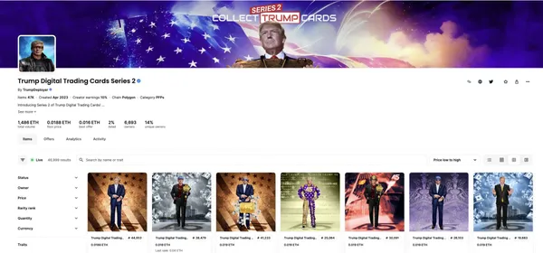 儘管NFT市場的表現近來相對平淡,川普的NFT仍具有良好的市場流動性。每當有關於川普的新聞出現時,這些NFT的交易量就會大增。例如,今年4月,當川普被起訴的消息公佈,其NFT的交易量就立刻上升了217%。