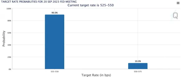 美國7⽉CPI年率3.2%,預期3.3%。其中核⼼CPI年率4.7%,預期4.8%,為2021年10⽉以來新低。CME顯⽰,美聯儲在9⽉20⽇會議不加息的概率為90%。
