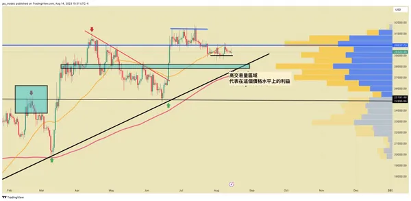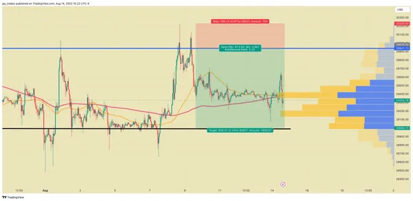 在上個星期,我們觀察到價格⼜接近29,000美元,結果是迅速獲得了3%的利潤,⽌盈點設定在30,000美元。隨後,在30,000美元附近出現了明顯的失敗突破,如果按照上述計劃進⾏的空頭交易被執⾏,⽬前將獲得2.44%的利潤,⽽不需要槓桿。這展⽰了我們在這些市場條件下的交易⽅法的有效性。
