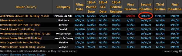 美國證券交易委員會(SEC)在裁決的最後期限8⽉13⽇前,擴⼤了對⽅⾈投資Ark 21Shares⽐特幣ETF申請的審查,同時繼續審查⾙萊德和富達投資等傳統⾦融巨頭的申請。