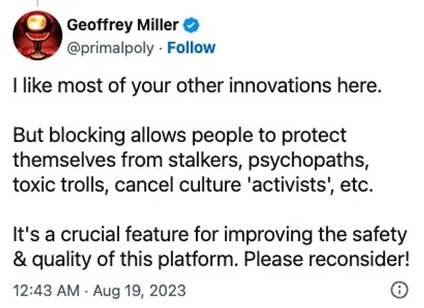 知名作家和心理學教授傑弗裡·米勒(Geoffrey Miller)公開表示:「我非常欣賞馬斯克在X的其他創新策略,但封鎖能讓用戶保護自己,與跟踪狂、心理變態、網路暴民等保持距離,這些人都是用戶潛在的威脅,為了提高平台的安全性和品質,請重新考慮取消封鎖功能。」