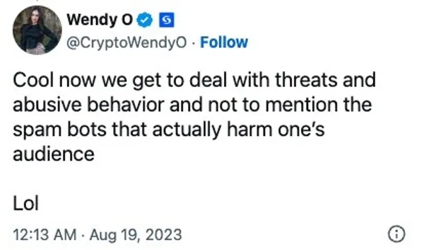 加密貨幣意見領袖Wendy O則諷刺地表示:「太好了,現在我們要面對的是威脅和虐待行為,更不用說那些真正傷害觀眾的垃圾郵件機器人。」
