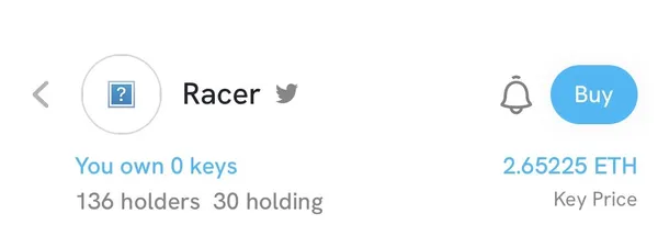 自Friend.tech成立以來,名叫「Racer」到用戶一直穩坐排行榜首,他不僅是該平台的匿名創辦人,更有著136位用戶持有他所發行的「股份」,現在每股的市價為2.65枚以太坊,約為新台幣14萬元。