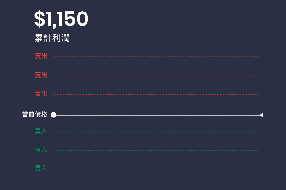設定完成後,網格機器人會在價格區間內,不斷做低買高賣頻繁套利,每上漲2塊就會賣出部分比例,跌2塊就買進部分比例(交易實際利潤計算=幣種價差*交易單位),當價格漲破或跌破設定的價格時,就會停止交易,直到幣價重新回到設定的區間才會繼續。