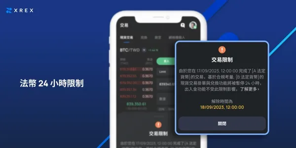 另一個需要特別注意的是,基於合規考量,XREX 交易所雖然目前提供美金與台幣雙法幣服務,但是當您使用某一法幣完成現貨交易掛單或完成兌換功能時,另一法幣的現貨交易掛單與兌換功能將暫停 24 小時,在 XREX app 上,也會顯示交易限制的倒數計時。出入金與網格交易機器人功能不受此限制影響。