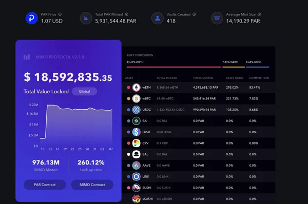 Parellel 允許用戶使用 WBTC、USDC 等資產進行超額抵押,以鑄造 PAR(歐元穩定幣) 和 paUSD(美元穩定幣),在 Mimo 的整體規劃中,無論是鏈上資產,還是鏈下資產,最終都將統一於流動性中。目前,Mimo TVL 達到 1800 萬美元,wETH、wBTC 和 USDC 構成了最主要的抵押品,並且抵押率都在 100% 以上,可保證完全贖回。