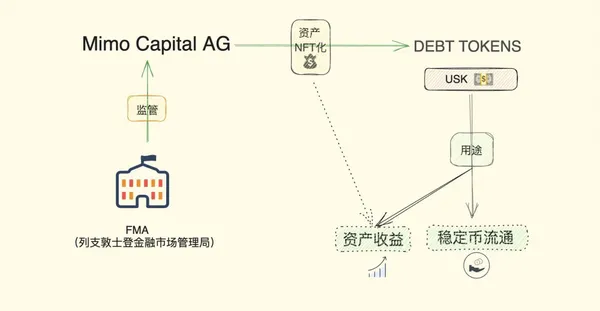 在此思路下,Mimo 創建了受監管的實體 Mimo Capital AG,由 FMA(列支敦斯登金融市場管理局)確保合規,以 CeFi 的思路對接債券市場和監管部門,同時,其會將債券資產進行 NFT 化,並且會基於債券 NFT 發行穩定幣,比如 USK 便是由美債支持的美元穩定幣,此時的穩定幣是一種持續產生利息的代幣,稱之為KIBT(生息代幣)。