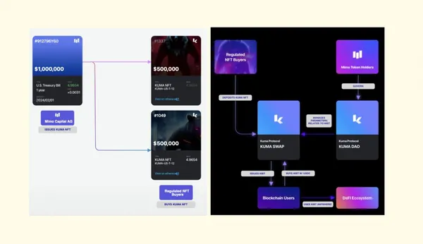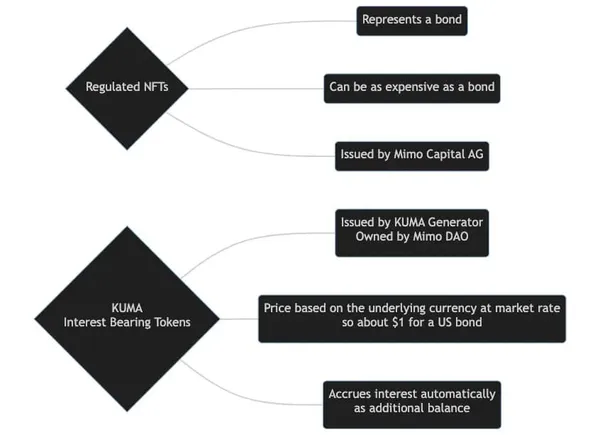 為了滿足不同資產發行的相容性,Kuma 實際上存在兩個運行主體,其一是 Mimo Labs 成立的 Mimo Capital AG ,其二是 Mimo 代幣持有人組建的 Kuma DAO。 前者負責發行基於債券資產的 NFT,後者基於這些資產再次發行債券代幣。