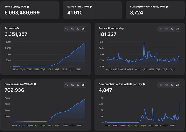 Ton 網絡目前驗證階段數量爲 343 個,TON 代幣質押量爲 4.86 億枚,占代幣總量的 9.5%,占流通代幣量的 14.12%。被銷毀代幣量爲 4.16 萬枚。