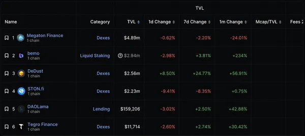 目前 TVL 達到 489 萬美元,占 TON TVL 的 50% 左右,在 TON DeFi 賽道中占主導地位。Megaton Finance 於今年 3 月獲得了 150 萬美元種子輪融資,由 TONcoin fund 領投,Cypher Capital、First Stage Labs、Orbs、MEXC Ventures 等機構參投。