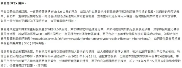 香港證券及期貨委員會(SFC)指出,該交易所在當地的運營未獲得許可,並警告當地民眾須注意風險。而 JPEX 於昨日官方公告表示,其由於香港相關機構對其的不公平對待及一系列負面新聞,導致合作的第三方市場製造者惡意凍結資金,才使得運營困難,用戶無法正常提領資金。