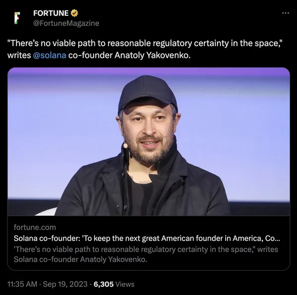 Solana的創辦人阿納托利·雅科文科(Anatoly Yakovenko)在9月18日的訪談中談到, 美國應加快對區塊鏈和加密貨幣的監管步伐。 他強調,為保持美國在全球技術競爭的領先地位,必須為這些新興技術提供清晰的監管政策。