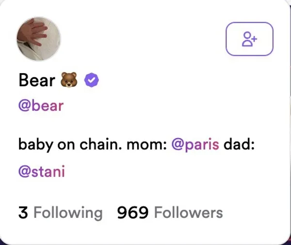 2023 年 7 月 4 日,他們的孩子 Bear Atlas Kulechov 在倫敦出生,並立刻享有了 Stani 創建的去中心化社交平台 Lens 的域名地址,從出生第一天就成為了「Baby on chain」,這也算是加密產業獨有的浪漫。