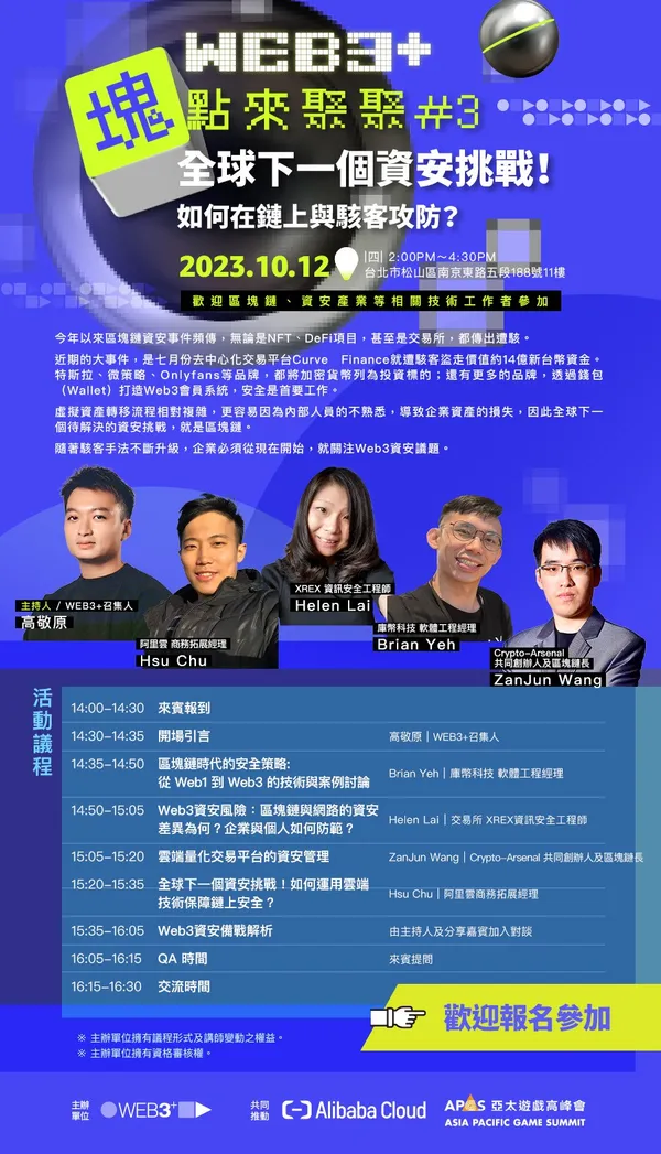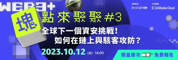 將於10月12號(週四)舉辦的第三場「塊點來聚聚」,將以「鏈上資安」為主題,瞄準區塊鏈、資安產業等相關技術工作者,歡迎對Web3轉型有興趣的從業人員一同參與。