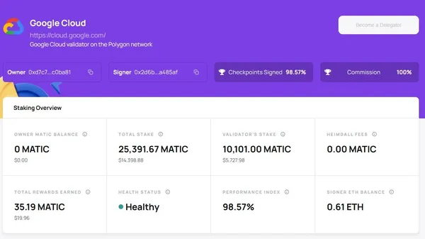 根據Polygon的質押儀表板,可以看到有許多不同的匿名用戶或是大型企業,透過質押MATIC成為Polygon區塊鏈的節點, 而Google雲端至今已在Polygon上質押了價值超過5,300美元的MATIC。