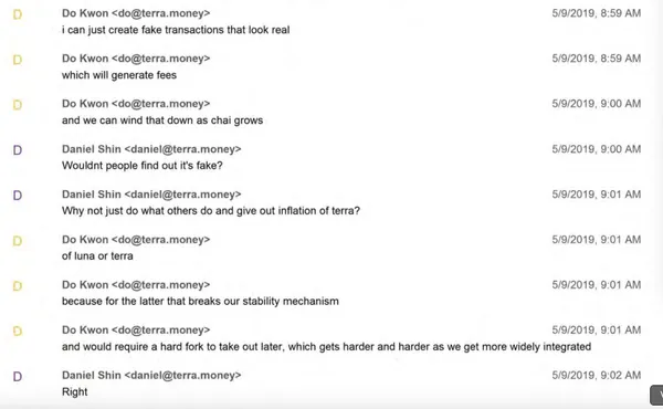SEC近期公開權渡衡與Daniel Shin於2019年在Slack上的對話紀錄,在對話中,權渡衡提出了建立假交易的想法。