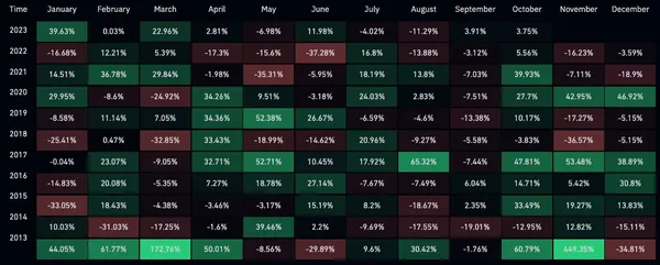 所謂的 Uptober,其實是來自國外的一個諧音梗,用來代指以往每逢 10 月就會出現的上漲行情,以「 October 」和「Up」兩個單詞拼湊而成,從數據分析網站 CoinGlass 提供的數據來看,自 2013 年以來,每年 10 月的加密貨幣市場幾乎都是正收益狀態,歷史上僅出現過兩次是負值。