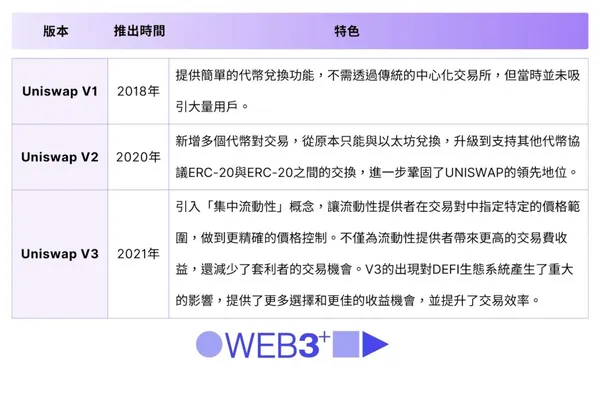 自2018年首次亮相以來,Uniswap已經成為全球最受歡迎的去中心化交易平台,也從最初的V1版本,進化到現在的V3版本,以下透過表格,整理三個版本的差異與特色,如果覺得字太小,點擊圖片可以放大方便閱讀。
