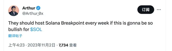 雖然對此番大漲,不少加密用戶戲谑 Solana 每逢 Breakpoint 必拉盤的操縱行爲,DeFiance Capital 創始人 Arthur 甚至調侃到,「如果開 Breakpoint 對於 Sol 的上漲如此有效,Solana 可以每周都開。」