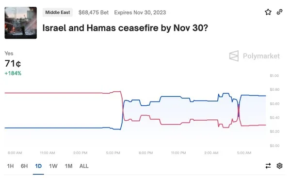 以及「以色列跟哈瑪斯之間的戰爭,會在今年11月30日前停火嗎?」目前預測會的人有71%。