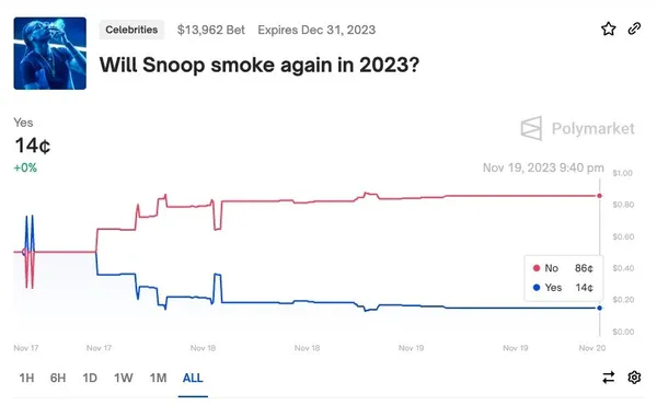 在加密貨幣預測平台Polymarket上,立刻出現了一個「Snoop Dogg是否能在2023年底前堅持不抽大麻?」的預測。