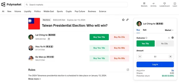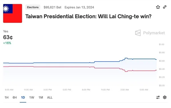 就連即將來臨的台灣總統大選也有預測押注,目前有預測賴清德獲勝的比例為63%。