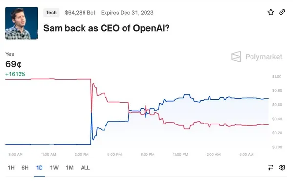 熱騰騰的時事「ChatGPT之父薩姆·奧特曼(Sam Altman)是否會重返OpenAI執行長的位置?」目前有69%的人預測會。