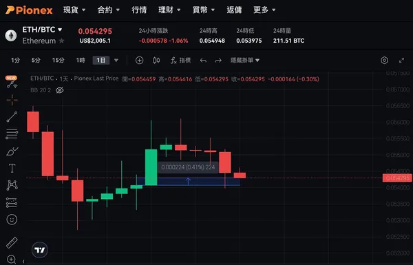 ETH/BTC 匯率約為 0.0542,七天上漲 0.41%,ETH 本週表現與 BTC 較為同步,無明顯強弱之分。
