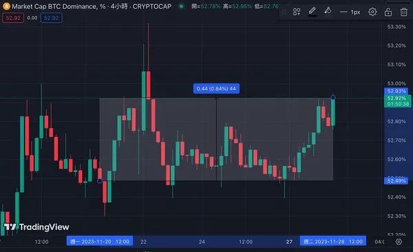 比特幣市占率(BTC.D),目前高達 52.9%,些微上升 0.84%,也代表目前比特幣走勢與其他幣種相比較為強勢。