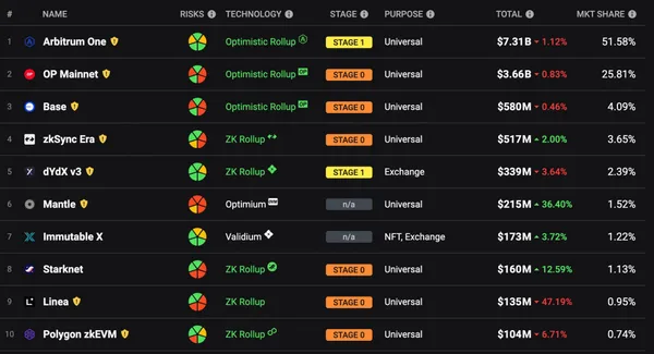 本週前 10 大 Layer 2 鎖倉量表現最好的是 Mantle,七天上漲 36.4%,力壓其他 Layer 2。原因是 Mantle 向 Lido 社區提交了「在 Mantle 上部署 wstETH」提案,目的是把握用戶 wstETH 的需求,將其轉化為 Mantle 生態中的關鍵部分,並成為國庫的主要資產。