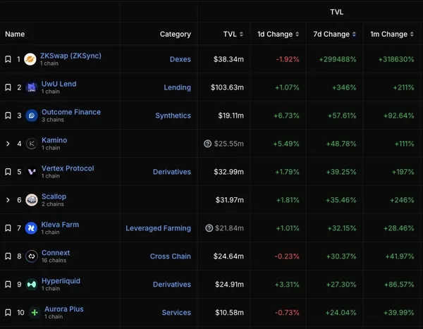 筆者挑選出七天內 TVL 增長最多,且符合至少擁有 1000 萬美元的協議,發現前 10 名圍繞在借貸、去中心化交易所以及收益平台。