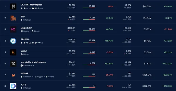 一位在以太坊擴容公司Taiko工作的分析師表示:「由於對Ordinals的巨大需求,OKX因為上線比特幣 Ordinals NFT的交易功能,讓其成為最大的NFT交易平台。Blur和OpenSea則因為不支援比特幣NFT的交易,讓他們在交易量方面逐漸落後。」