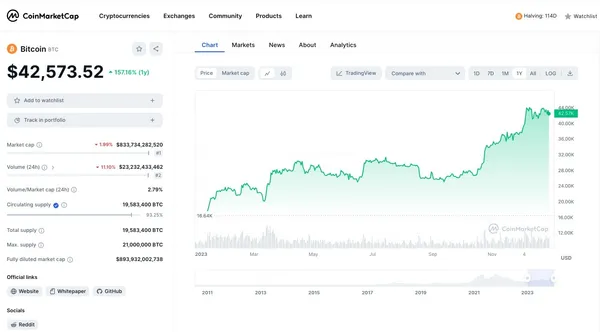 截至目前,根據CoinMarketCap數據,截稿時的比特幣價格為42,573美元,較年初的16,000美元大幅上漲,每日交易量保持在約800億美元的穩定水平。這反應出市場對比特幣的認知正在進化,從早期的投機性交易轉向更多元化和成熟的投資策略。